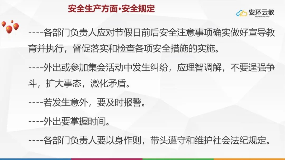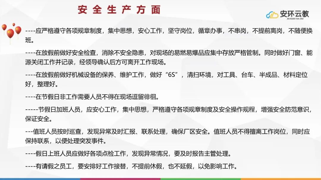 在十一假期來臨之際,為了保證大家渡過愉快、祥和、安全的假期,減少節假日前后及節假日安全事故的發生,安全從業人員必須要遵守安全生產、危險作業、消防安全、用電安全、交通安全、新冠疫情等方面的注意事項。