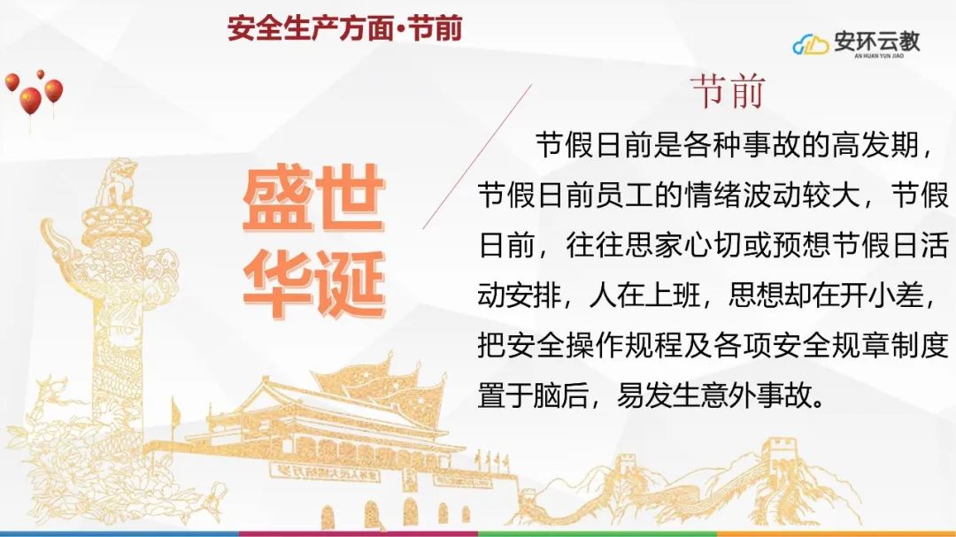 節假日前是各種事故的高發期,節假日前員工的情緒波動較大,節假日前,往往思家心切或預想節假日活動安排,人在上班,思想卻在開小差,把安全操作規程及各項安全規章制度置于腦后,易發生意外事故。
