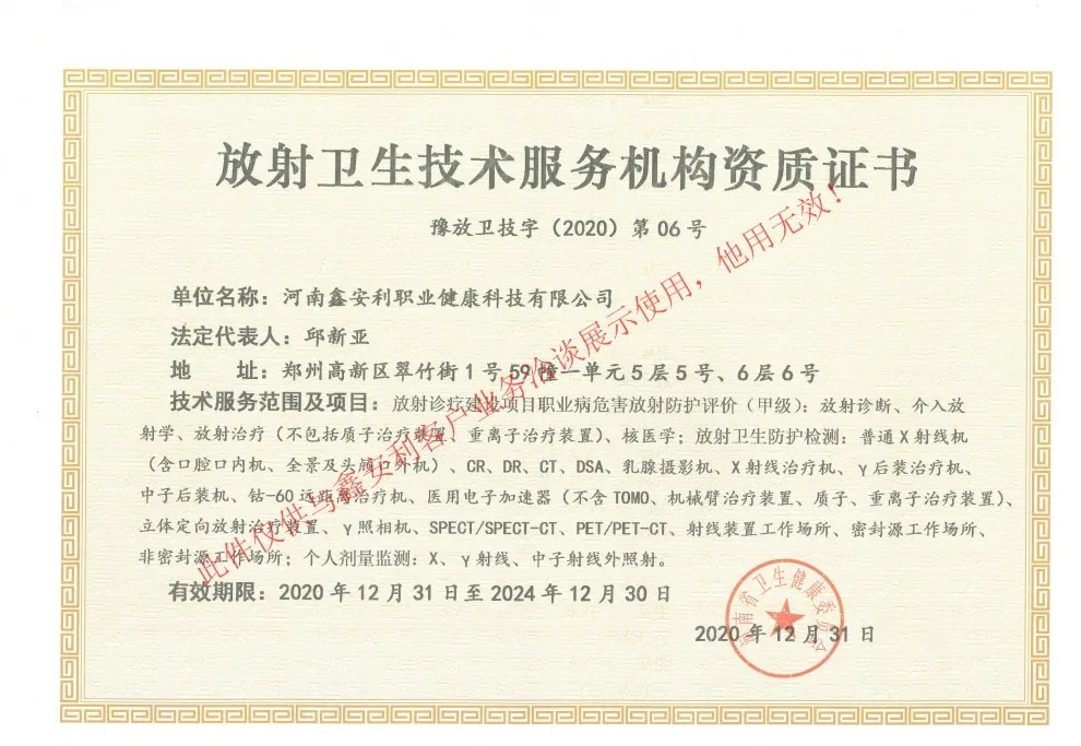 鑫安利獲得放射衛(wèi)生技術(shù)服務(wù)甲級(jí)資質(zhì),服務(wù)實(shí)力再上新臺(tái)階!-河南鑫安利安全科技股份有限公司